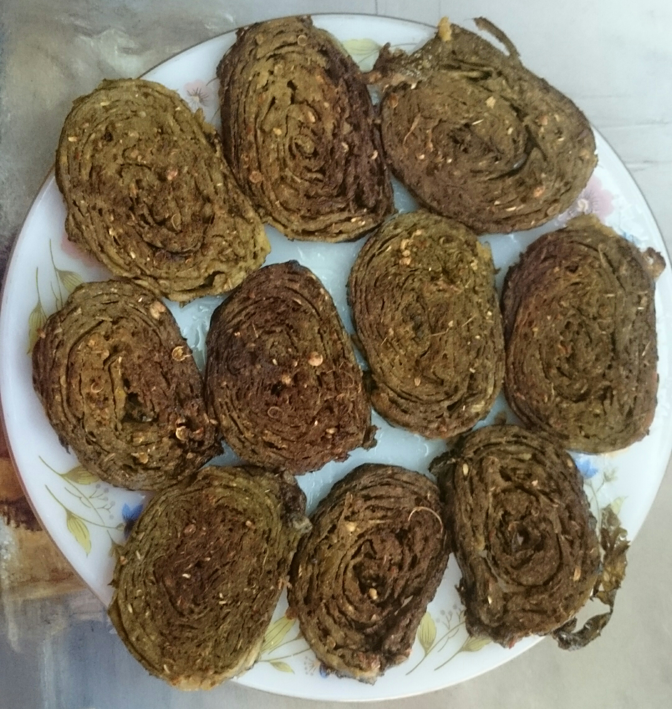 aloo-leavesAlu wadi or Patrode is a traditional maharashtrian and gujrati dish made from Colocasia leaves. We get two types of leaves. Some are thin and small where as the other types are thick and big. The leaves used for alu wadi should be thick and big and they should not be itchy. Ask the vendour if they are specifically for making wadi. A spicy batter is applied to the leaves, rolled on and steamed. The steamed roll is then sliced. The slices can be shallow fried/ deep fried or just give vaghar of sesame seeds and mustard seeds . The batter is usually made of chickpea flour (besan) and the spices. My mother use to add some crushed green gram (moong) sprouts or sometimes just the peels of moong sprouts to make them crispier. I got this idea of recipe from her to make the alu wadi more nutritious by adding more sprouts and reducing the amount of chickpea flour. It turned out more crispier, tastier and healthier.