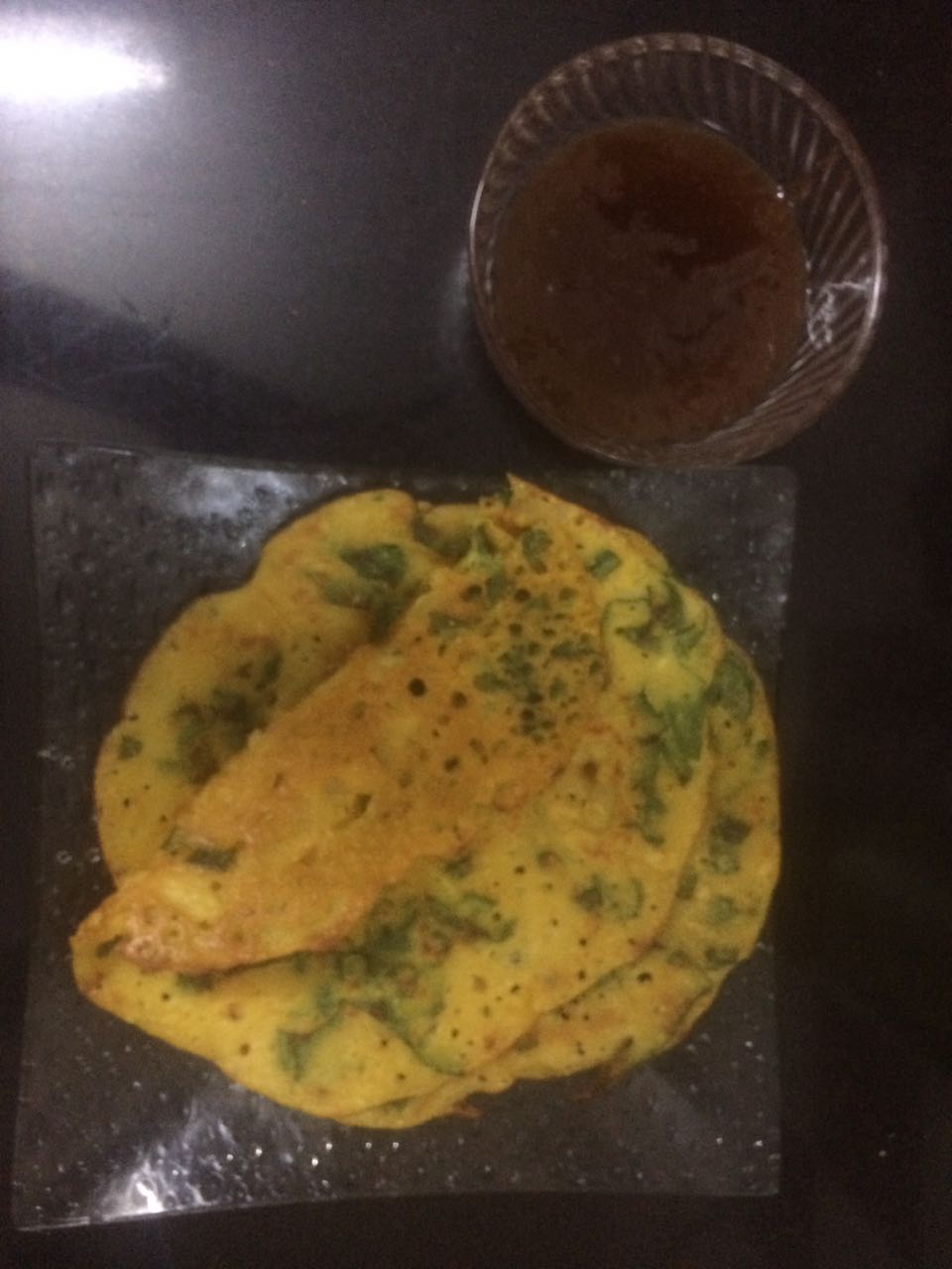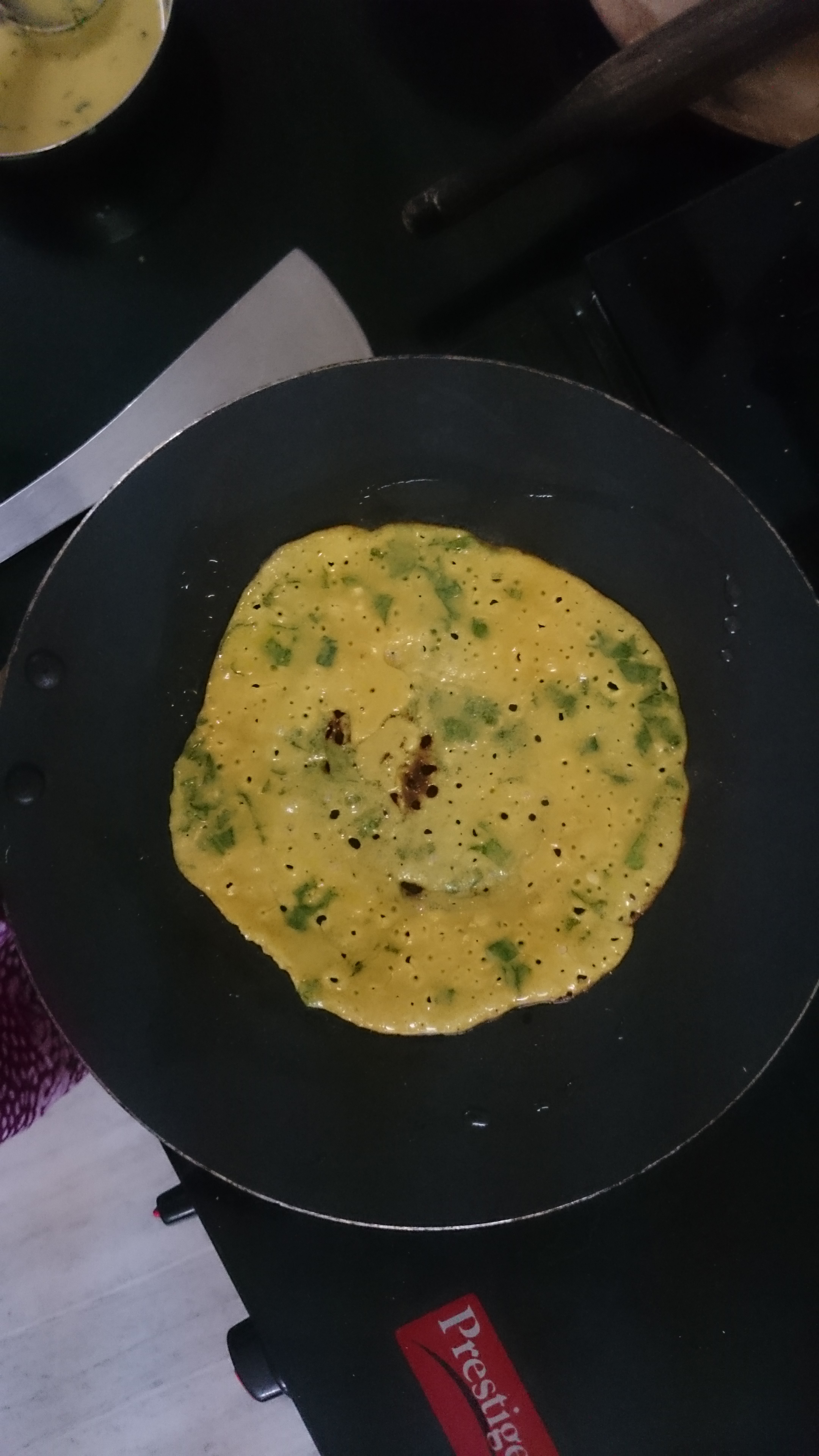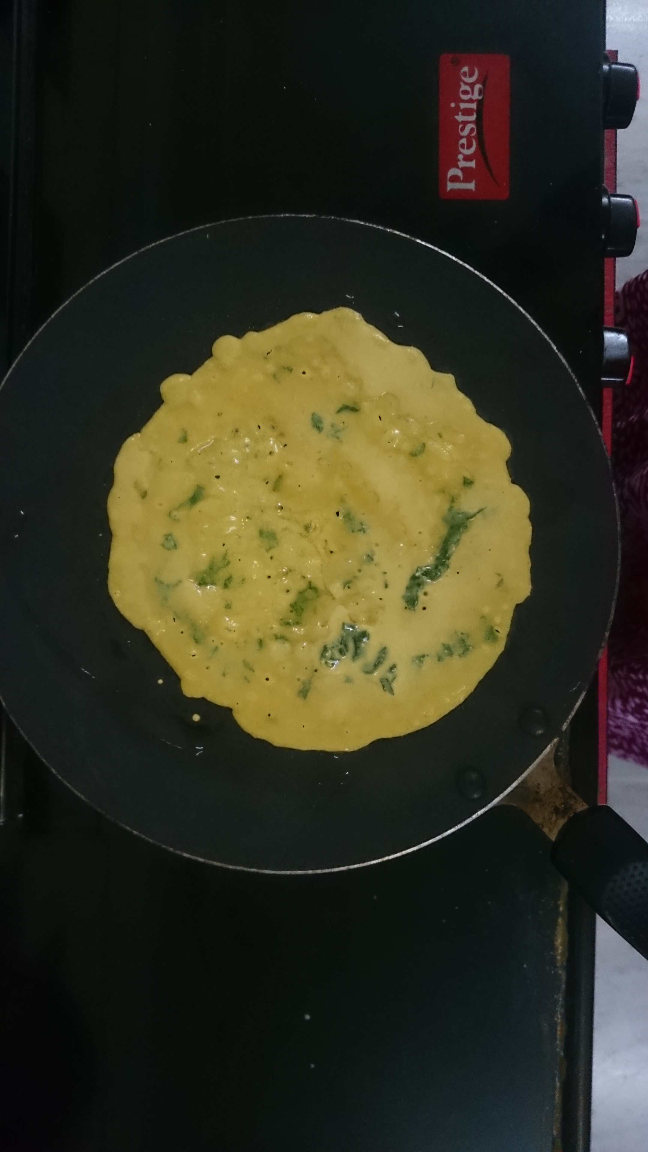 - Pour 1 laddle full of the mixture spreading evenly to make thin pancakes of 4-6 inches diameter